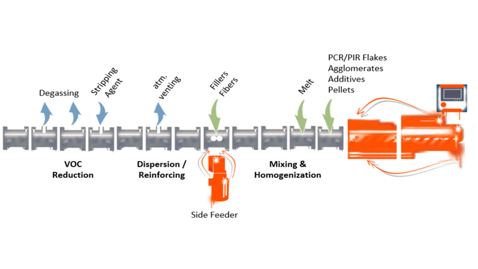 Bei Bedarf kann Granulat-Neuware über eine gravimetrische Dosierung auch direkt in die ursprüngliche Extruderöffnung, noch vor Eintritt der Schmelze, eingebracht werden. Flüssige Additive – etwa Wasser für Stripping-Anwendungen – werden dagegen druckgesteuert über Einspritzdüsen mit Flüssigkeitspumpen zudosiert.