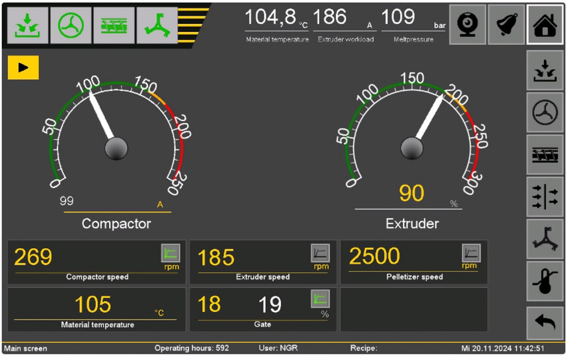 Bei Bedarf kann Granulat-Neuware über eine gravimetrische Dosierung auch direkt in die ursprüngliche Extruderöffnung, noch vor Eintritt der Schmelze, eingebracht werden. Flüssige Additive – etwa Wasser für Stripping-Anwendungen – werden dagegen druckgesteuert über Einspritzdüsen mit Flüssigkeitspumpen zudosiert.