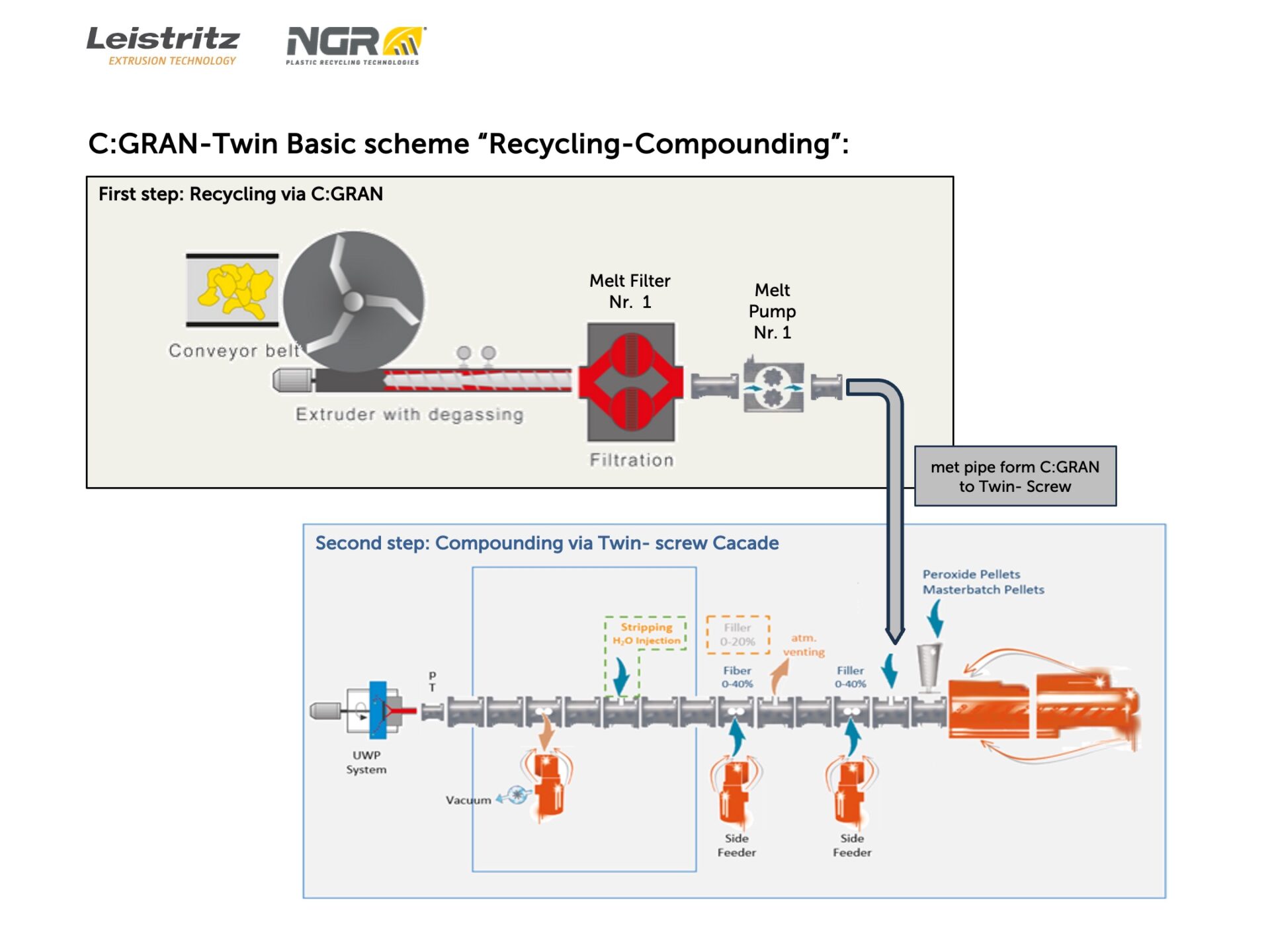 Recycling und Compounding in einem durchdachten Prozess – C:GRAN und eine Doppelschnecke als Compounding- Kaskade. Zwei ausgereifte Technologien, zusammengeführt für die Produktion von maßgeschneiderten & hochwertigen Re-Granulaten.