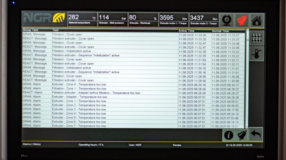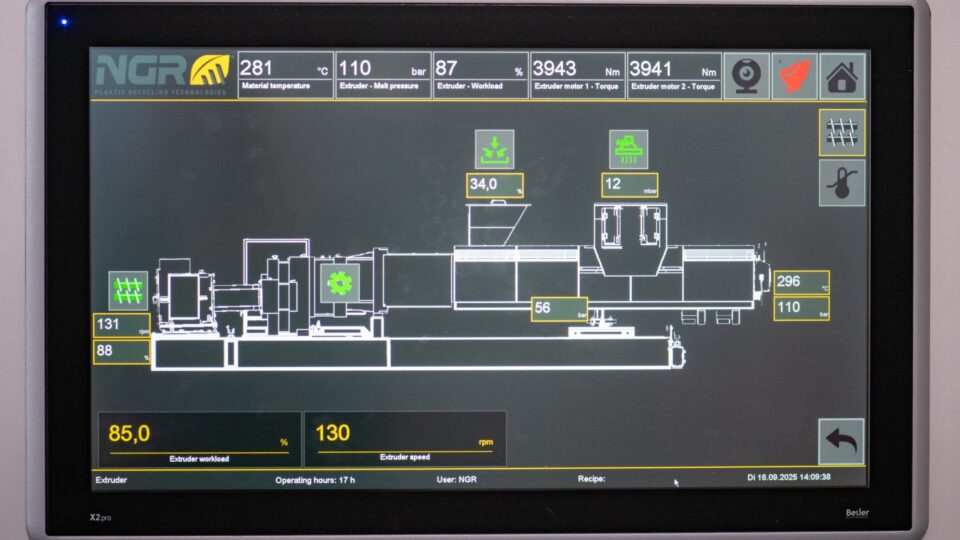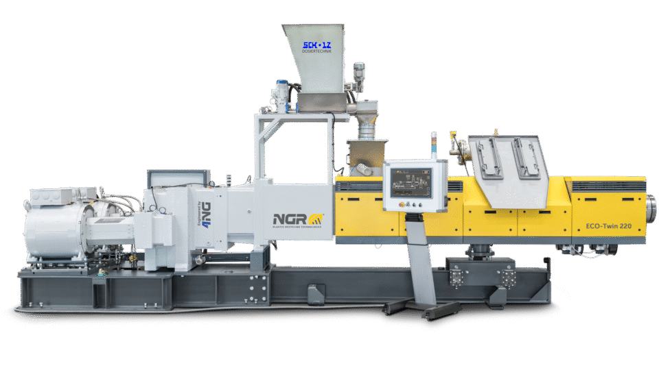 Mit dem konisch-gleichlaufenden ECO-Twin Extruder setzt NGR neue Maßstäbe in der Aufbereitung von PET-Mahlgüter. Unschlagbar niedriger Energieverbrauch, gepaart mit einem sehr schonenden Aufschmelzprozess bei sehr effektiver Schmelzeentgasung, bietet dieser