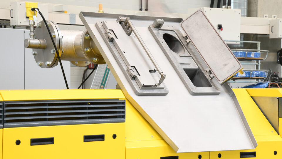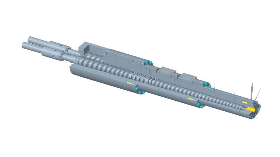 Der Zylinder ist über eine Kupplungsglocke mit dem Getriebe verbunden, die mechanische Schwingungen dämpft. Die Schnecken sind im Flanschbereich gelagert, was die Stabilität erhöht. Der Zylinder lässt sich beidseitig ausschwenken, was einen platzsparenden Ausbau der Schnecken ermöglicht – ideal für Anlagen zur Herstellung von Halbzeugen wie Folien.