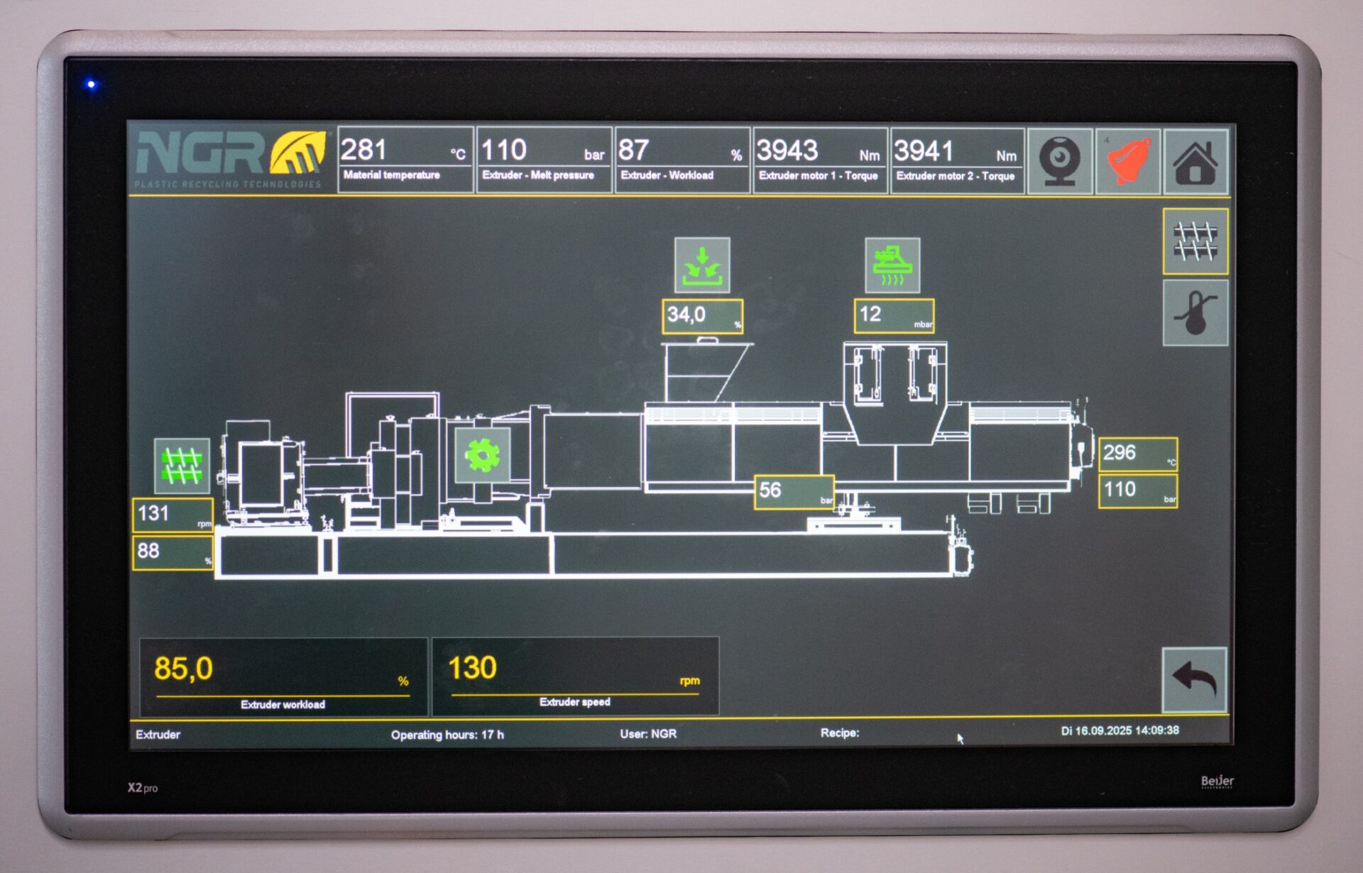 Der Extruderantrieb ist mit variabler Drehzahl ausgestattet. Dadurch kann der Durchsatz der Anlage auf die jeweiligen verfahrenstechnischen Gegebenheiten perfekt abgestimmt werden.
