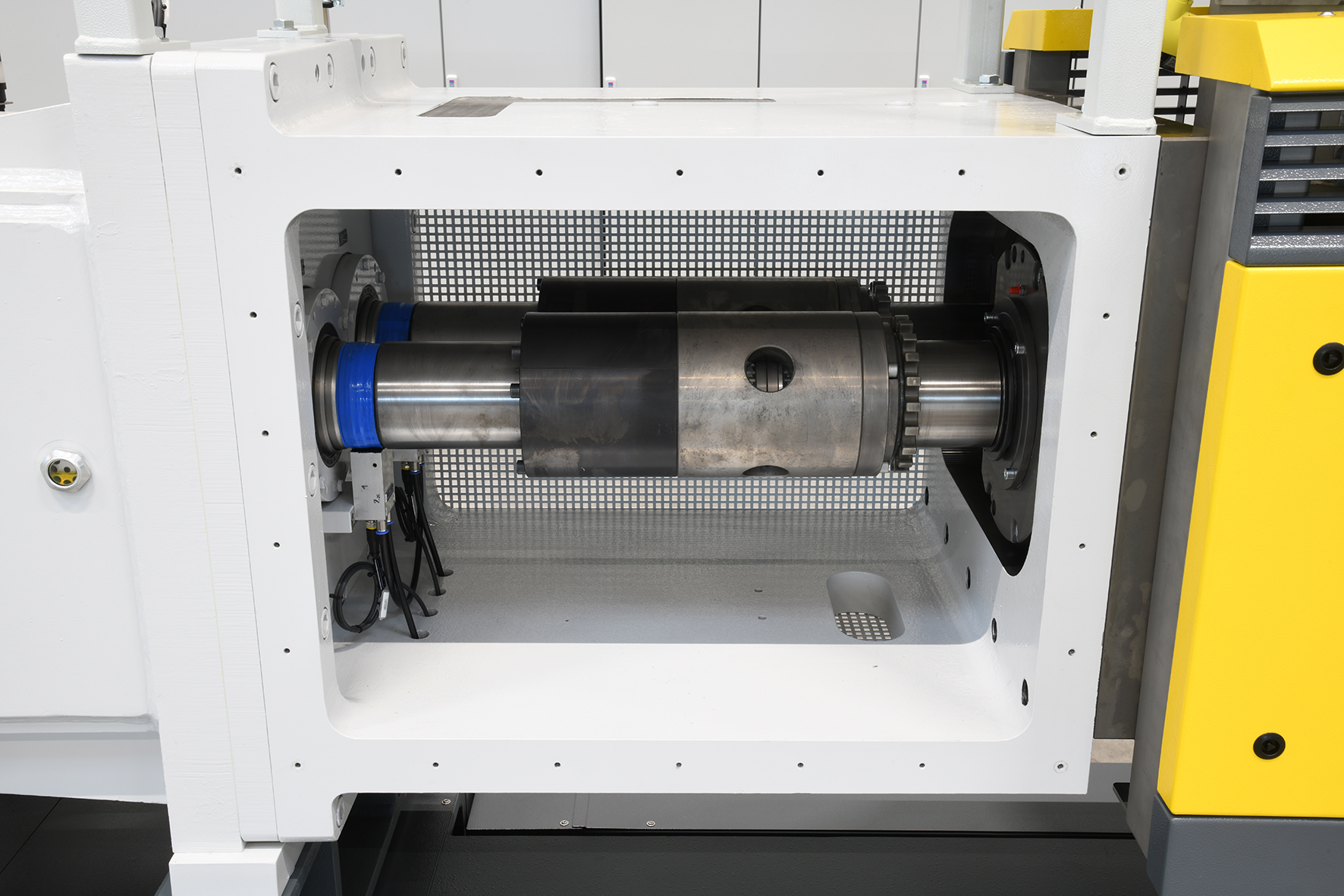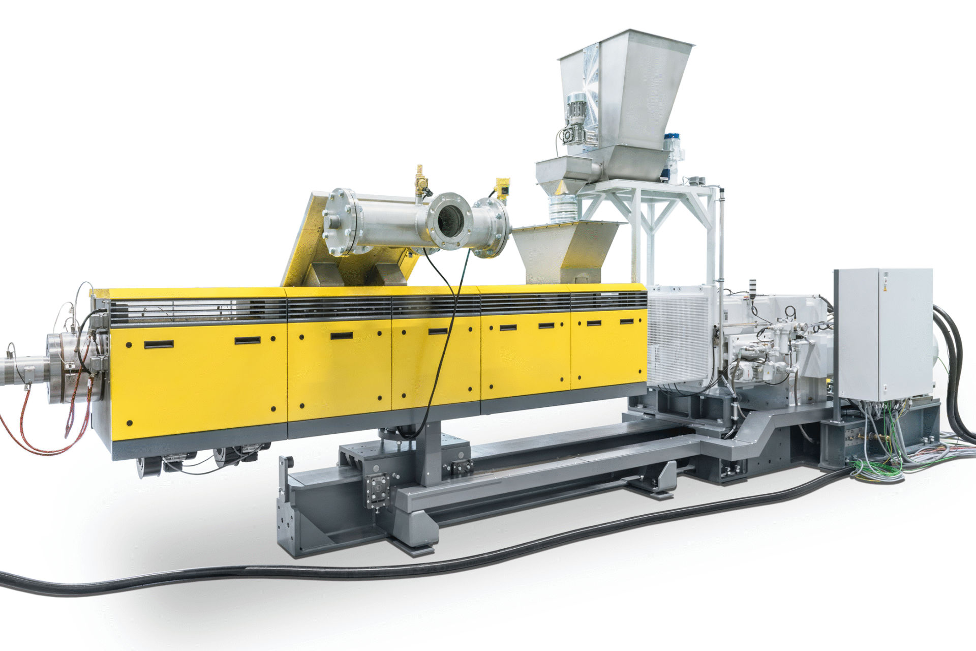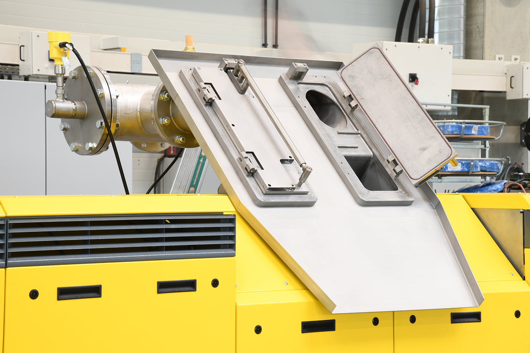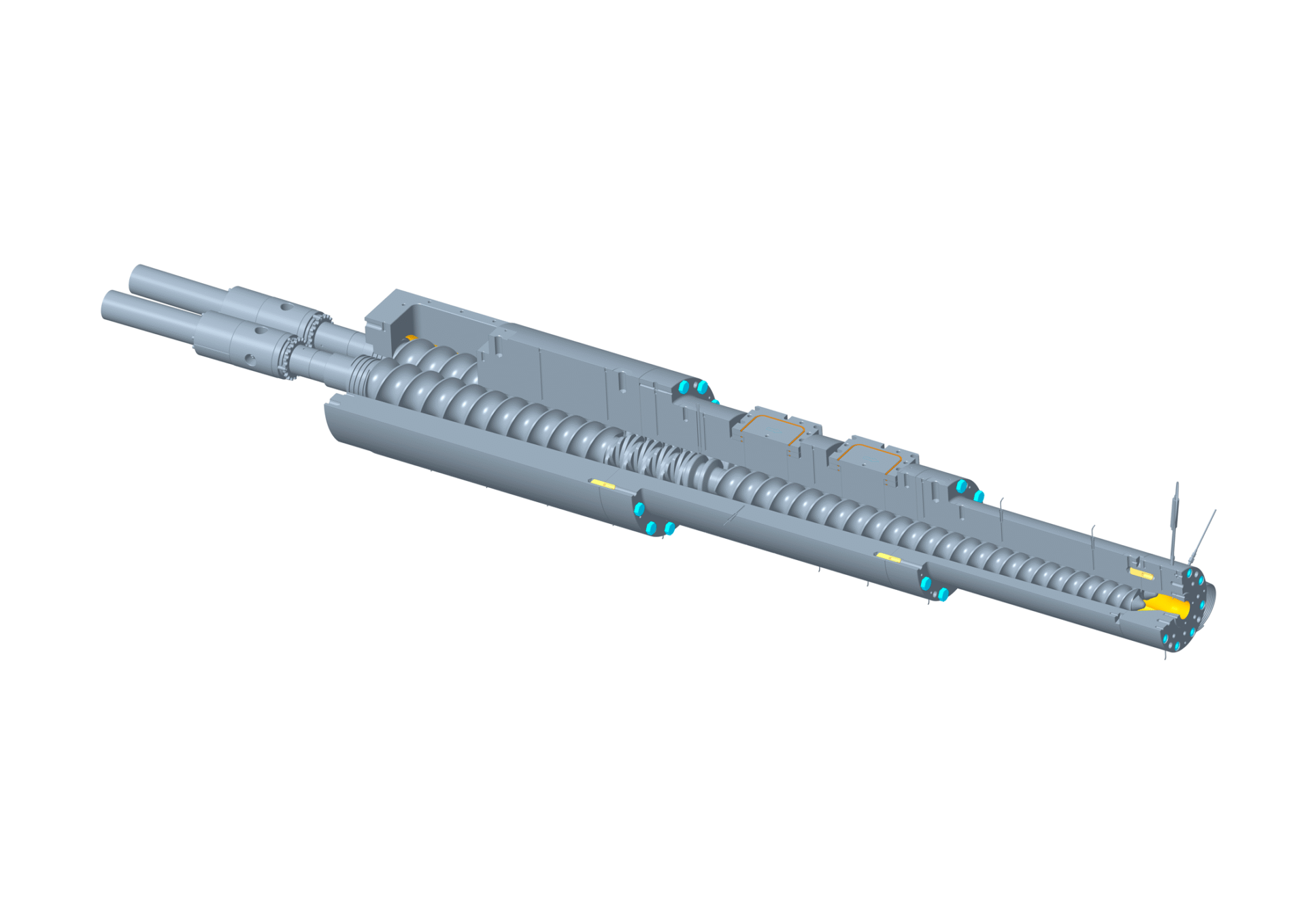 Der Zylinder ist über eine Kupplungsglocke mit dem Getriebe verbunden, die mechanische Schwingungen dämpft. Die Schnecken sind im Flanschbereich gelagert, was die Stabilität erhöht. Der Zylinder lässt sich beidseitig ausschwenken, was einen platzsparenden Ausbau der Schnecken ermöglicht – ideal für Anlagen zur Herstellung von Halbzeugen wie Folien.