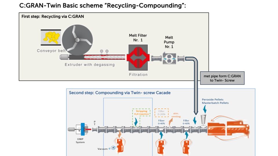 Recycling and compounding in a well-thought-out process – C:GRAN combined with a twin-screw extruder as a compounding cascade. Two proven technologies brought together for the production of customized, high-quality regranulates.